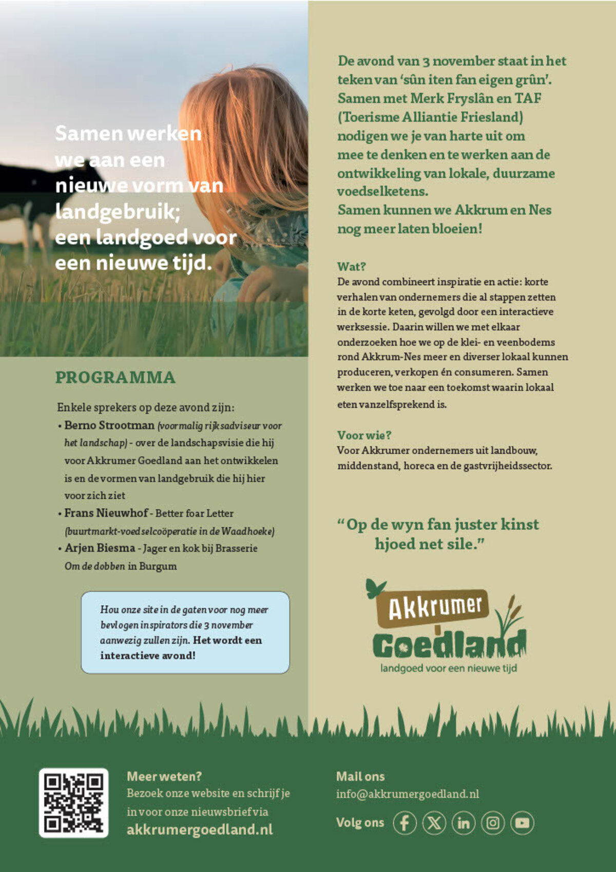 Steeds meer Friese dorpen zetten stappen richting een duurzamer voedselsysteem. Ook in Akkrum en Nes groeit de aandacht voor gezond eten van dichtbij, daarom organiseert Akkrumer Goedland op maandag 3 november van 19.30 tot 22.00 uur de inspiratiebijeenkomst “Sûn iten fan eigen grûn” in samenwerking met Merk Fryslân en de Toerisme Alliantie Friesland (TAF).